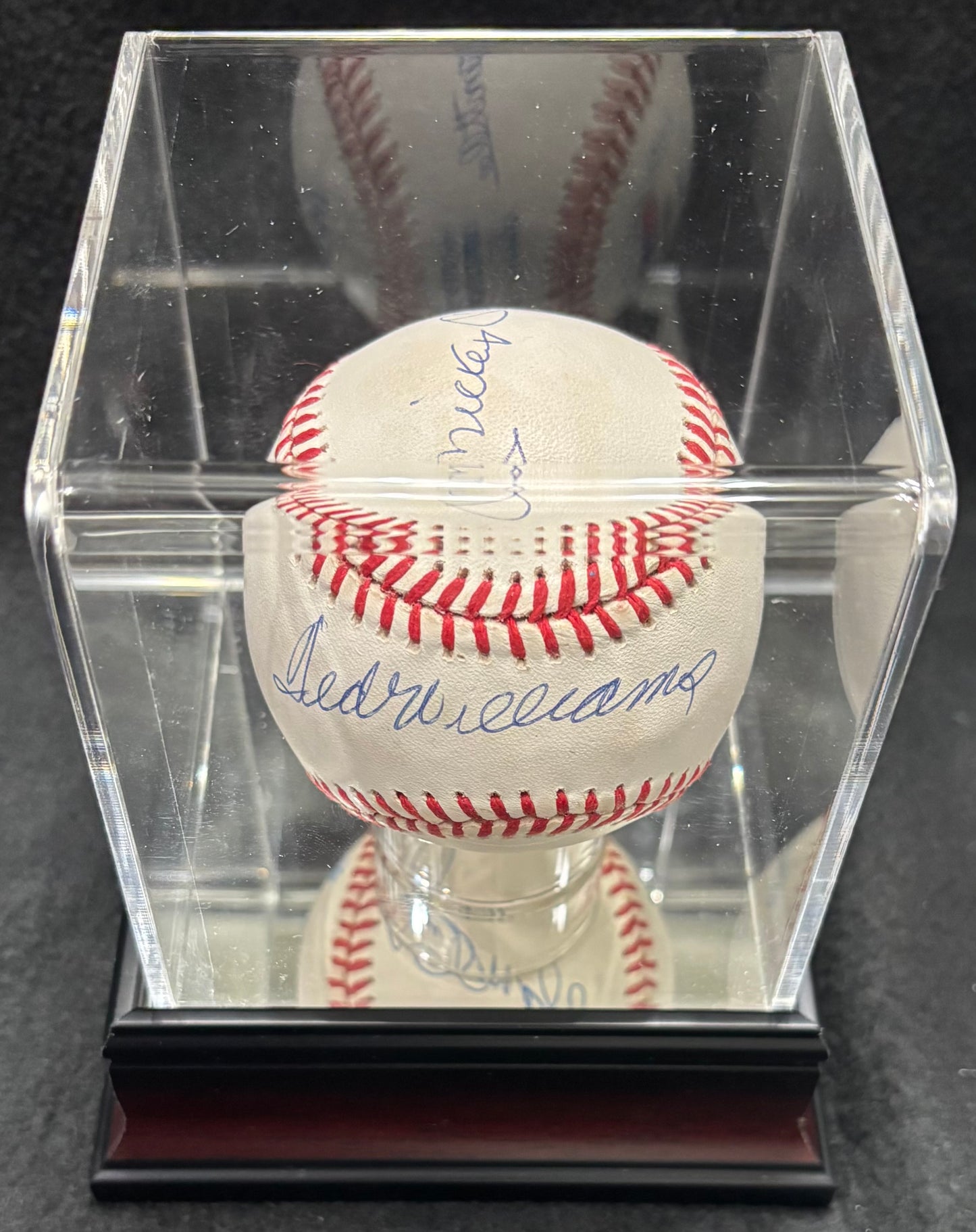 Offered here is a gorgeous Mickey Mantle, Ted Williams, and Joe Dimaggio signed official American League ball!! The quality of the signatures are quite nice (graded an overall 8.5 by PSA), ball is also pretty clean. PSA/DNA full letter with matching sticker accompany this amazing item! Comes with a high end wood/mirrored base display case. This piece would make an incredible addition to any baseball fan's collection. Ships fully insured, well packed, within 1 business day. Thank you very much!
